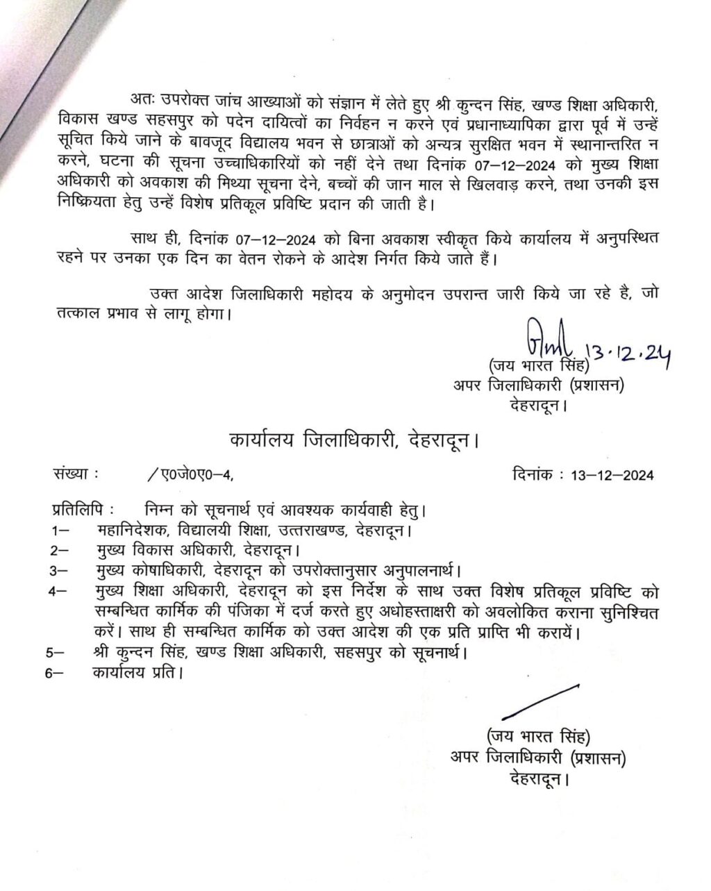 जांच आख्याओं का संज्ञान लेते हुए डीएम ने खण्ड शिक्षा अधिकारी विकासखण्ड सहसपुर को पदेन दायित्वों का निर्वहन न करने एवं प्रधानाध्यापिका द्वारा (पत्राचार के माध्यम से) पूर्व में सूचित किये जाने के बावजूद भी विद्यालय भवन से छात्राओं को अन्यत्र सुरक्षित भवन में स्थानान्तरित न करने, घटना की सूचना उच्चाधिकारियों को न देने तथा मुख्य शिक्षा अधिकारी को अवकाश की मिथ्या सूचना देने, बच्चों की जानमाल से खिलवाड़ करने पर कार्यवाही की गई। डीएम ने खण्ड शिक्षा अधिकारी की निष्क्रियता हेतु 01 दिन का वेतन रोकते हुए विशेष प्रतिकूल प्रविष्टि की कार्यवाही की गई।