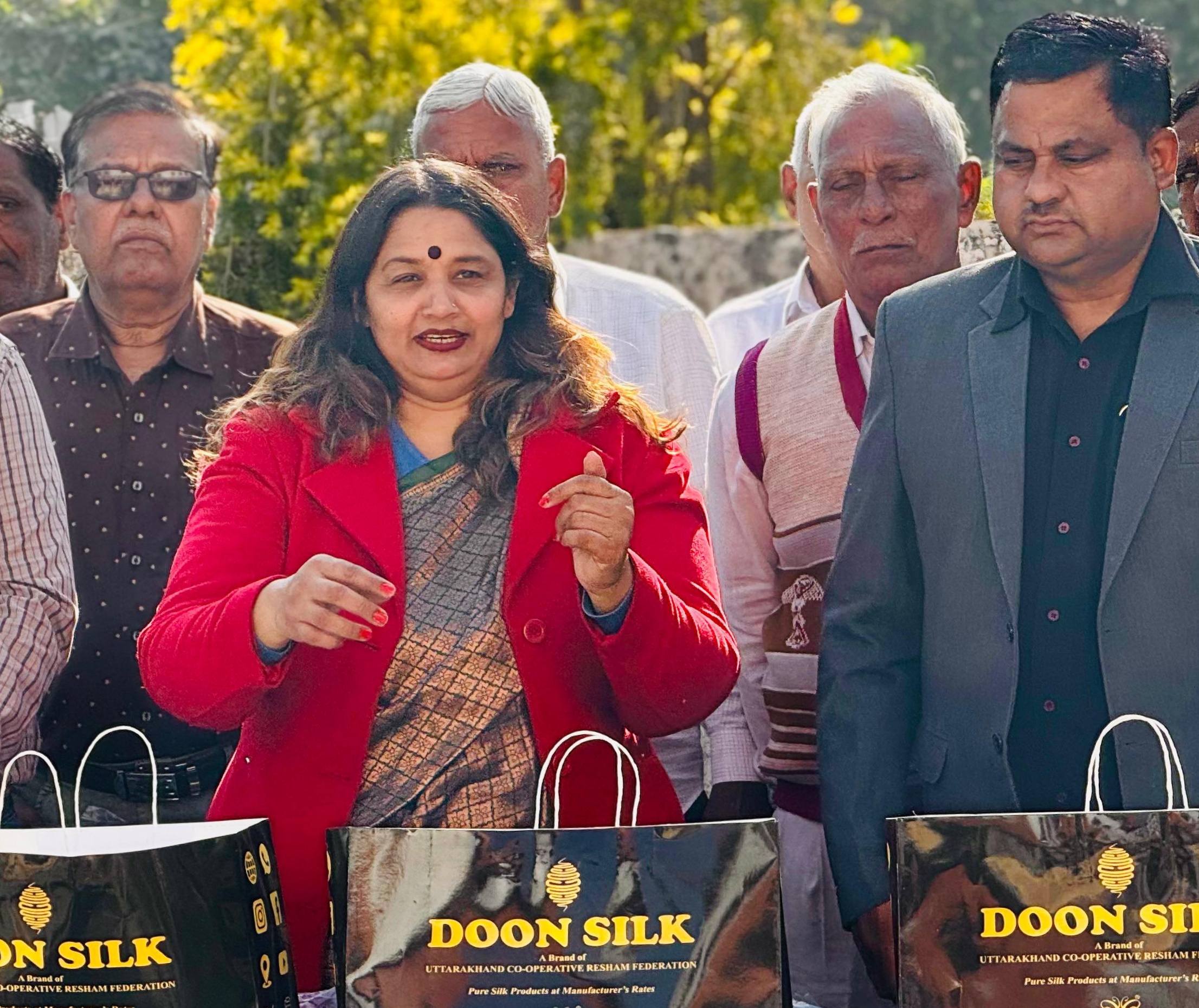 दून सिल्क की ब्रांड प्रमोटर श्रीमती गीतांजली नेगी ने भ्रमण दल को उत्तराखंड राज्य के रेशम ब्रांड दून सिल्क के उत्पाद स्मृति के रूप में भ्रमण दल को भेट किए गए एवं भ्रमण दल को ब्रांड दून सिल्क एवं पूर्ण मुख्य श्रृंखला के बारे में विस्तार से बताया गया