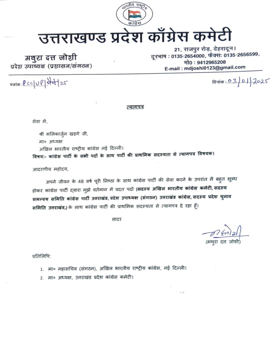 वरिष्ठ कांग्रेस नेता मथुरादत्त जोशी ने कांग्रेस पार्टी से दिया इस्तीफ़ा