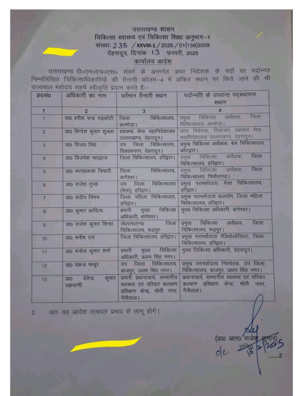 प्रदेश में स्वास्थ्य सेवाओं को और अधिक प्रभावी एवं सुचारू बनाने के उद्देश्य से स्वास्थ्य विभाग द्वारा विभिन्न जिलों में मुख्य चिकित्सा अधिकारी (CMO) और मुख्य चिकित्सा अधीक्षक (CMS) के पदों पर आवश्यक प्रशासनिक बदलाव किए गए हैं।