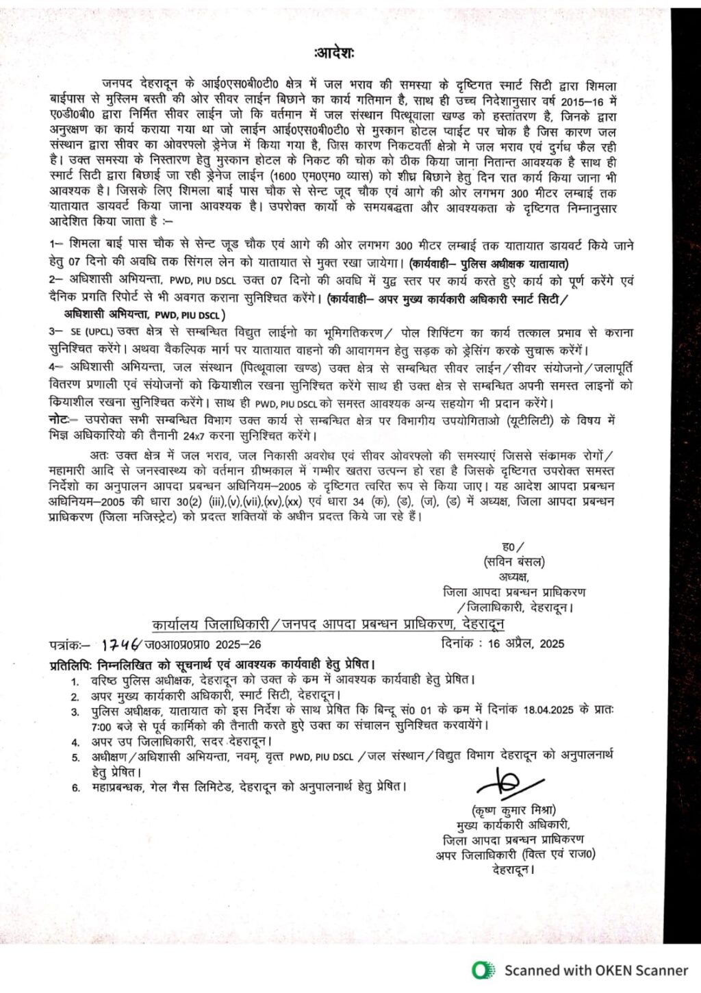 देहरादून: 18/04/2025 से 24/04/2025 तक शिमला बाईपास से मेहूँवाला रोड पर जिला आपदा प्रबंधन अधिकारी/जिलाधिकारी देहरादून के आदेशानुसार स्मार्ट सिटी देहरादून द्वारा ड्रेनेज पाईप लाईन बिछाने कार्य किया जाना प्रस्तावित है। जिसके दृष्टिगत उक्त मार्ग पर यातायात डायर्वट प्लॉन निम्नवत रहेगा।