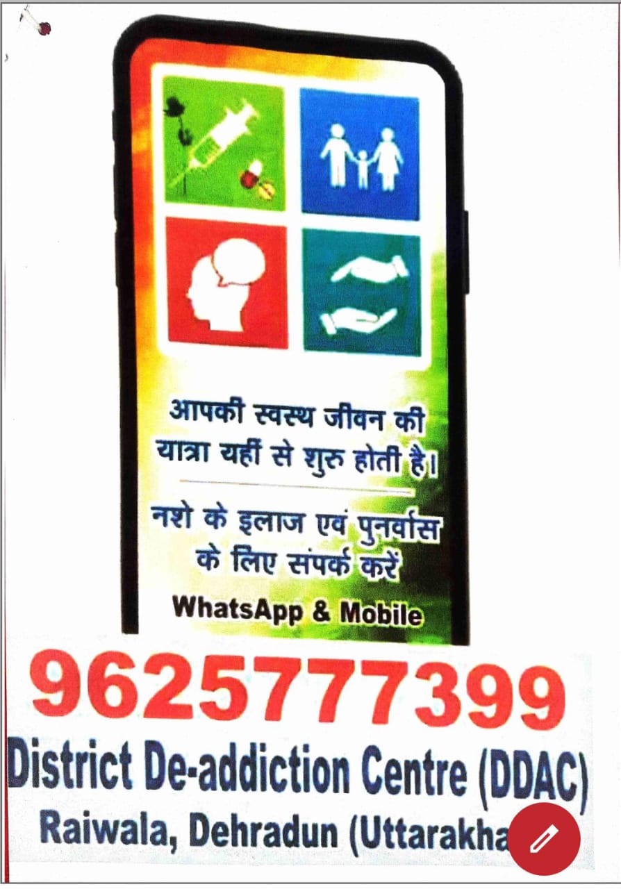 समाज को नशे की बुराई से मुक्त करने की दिशा में जिला प्रशासन ने एक महत्वपूर्ण कदम उठाते हुए देहरादून रायवाला में राजकीय नशा मुक्ति केंद्र का संचालन किया गया है। इस केंद्र के माध्यम से अब नशा पीड़ित व्यक्तियों को निःशुल्क परामर्श, चिकित्सा और पुर्नवास की सुविधाएं उपलब्ध कराई जा रही है। जिला समाज कल्याण अधिकारी दीपांकर घिल्डियाल ने बताया कि जिलाधिकारी के दिशा निर्देशन में समाज कल्याण विभाग द्वारा स्वैच्छिक संस्था एसपीवाईएम के सहयोग से नशा मुक्ति केंद्र का संचालन किया जा रहा है।