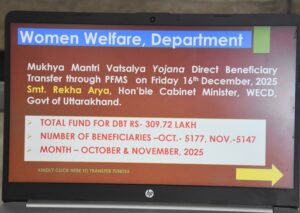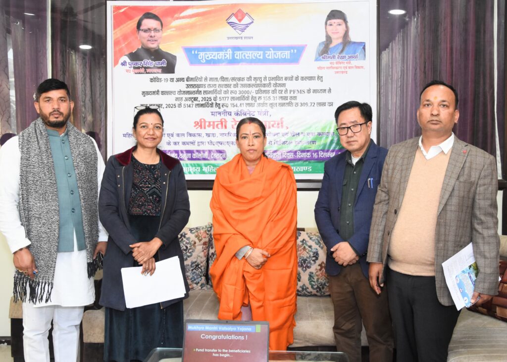 मंगलवार को महिला सशक्तिकरण एवं बाल विकास मंत्री रेखा आर्या ने मुख्यमंत्री वात्सल्य योजना के तहत लाभार्थियों को 3 करोड़ 9 लाख रुपए से ज्यादा की धनराशि जारी की।