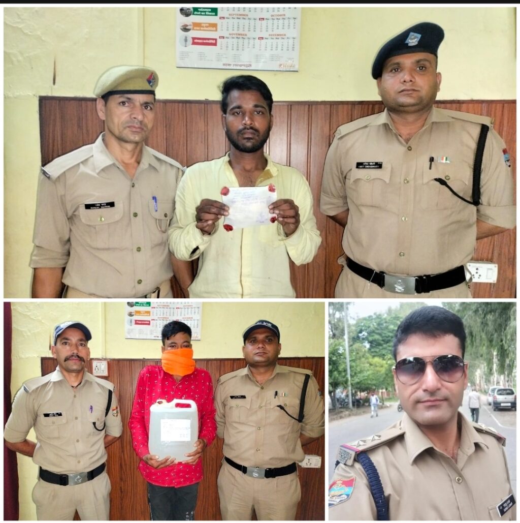 हरबर्टपुर चौकी प्रभारी पंकज कुमार के द्वारा बताया गया कि क्षेत्र में गठित टीम द्वारा दिनांक ग्राम आदुवाला जुड़ली से एक युवक विकास पुत्र फूल सिंह निवासी आदुवाला जुडली थाना विकासनगर, देहरादून उम्र 25 वर्ष को रोककर चेक किया गया तो उसके पास से 157 ग्राम अवैध चरस बरामद हुआ और वही दूसरी ओर ग्राम शाहपुर कल्याणपुर से स्थानीय निवासी अभियुक्त सुनील पुत्र राजेंद्र उम्र 27 वर्ष निवासी शाहपुर कल्याणपुर को 10 लीटर अवैध कच्ची शराब की जरीकेन के साथ गिरफ्तार किया गया ।अभियुक्त विकास के विरुद्ध कोतवाली नगर में एनडीपीएस अधिनियम के अंतर्गत और अभियुक्त सुनील के विरुद्ध अन्तर्गत धारा 60 आबकारी एक्ट के तहत अभियोग पंजीकृत किया गया। अभियुक्तों को समय से माननीय न्यायालय के समक्ष पेश किया जाएगा। पुलिस टीम में उ0नि0 पंकज कुमार, चौकी प्रभारी चौकी हरबर्टपुर का० अमित कुमार,का० प्रवीण कुमार शामिल रहे।