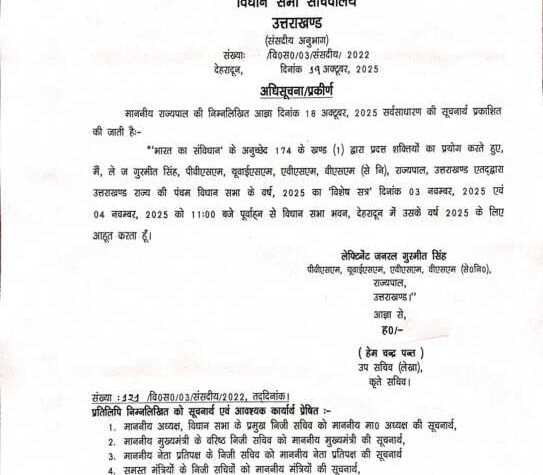 Uttarakhand देहरादून नवम्बर में होगा उत्तराखण्ड विधानसभा का विशेष सत्र आहूत, राज्यपाल ने जारी की अधिसूचना October 19, 2025 News India24 UK इस दिन होगा उत्तराखण्ड विधानसभा का विशेष सत्र आहूत, राज्यपाल ने जारी की अधिसूचना...