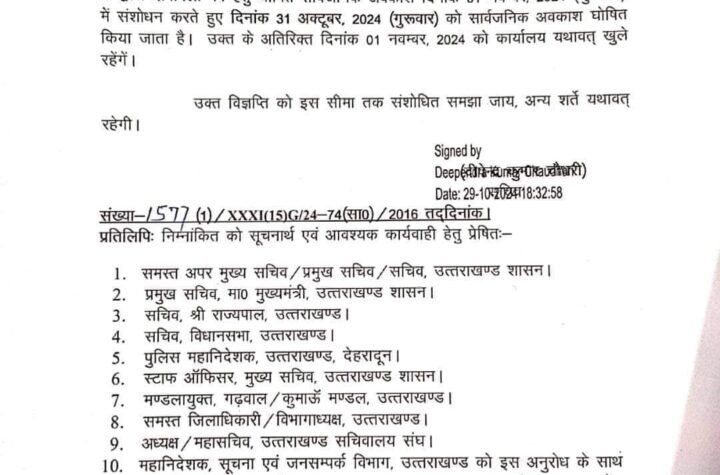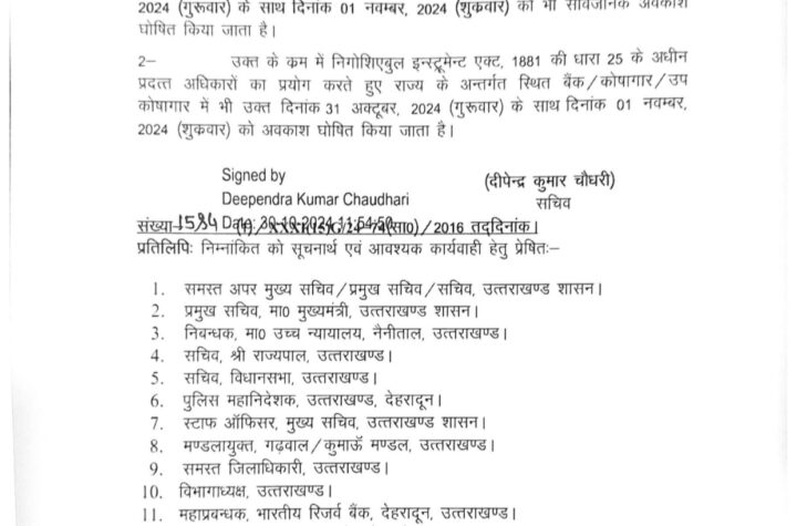 देहरादून : 30 अक्टूबर 2024 उत्तराखण्ड राज्य में सार्वजनिक अवकाश घोषित किये जाने विषयक अधिसूचना...