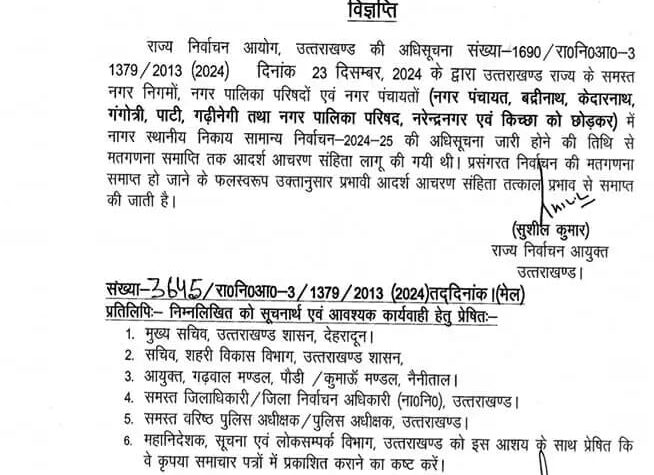 देहरादून : राज्य निर्वाचन आयोग, उत्तराखण्ड की अधिसूचना संख्या-1690/रा०नि०आ०-3 1379/2013 (2024) दिनांक 23 दिसम्बर,...